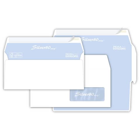 Buste Silver80 Strip FSC in carta bianca da grammi 80, internografate, patella a taglio quadro con strip, formato 110x230 mm con finestra 40x100 mm