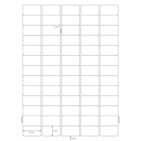 Etichette universali 38,1x21,2 mm, colore bianco. Margine superiore e inferiore foglio 10,1x10,1 mm. Margine sinistro e destro foglio 3,87x3,87 mm. Confezione 100 fogli, 65 etichette per foglio, 6500 etichette complessive. Grammatura 70 gr/mq. Forma rettangolare, non removibili. Angoli squadrati.