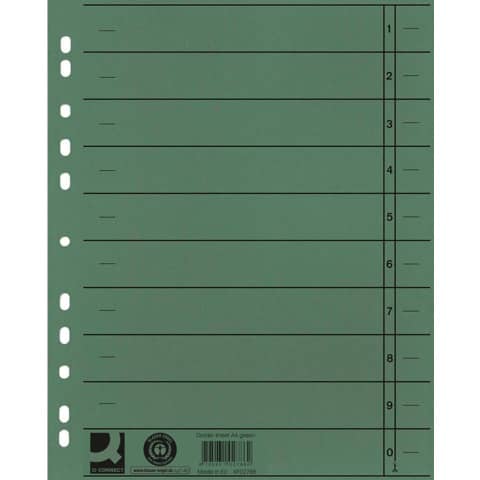 Separatore per archivio formato A4. Cartoncino riciclato al 100% da 230 g/mq, dimensioni 24 x 30 cm. Con perforazione universale, stampato con linee di taglio e di testo. Premiato con il marchio di qualità ecologica Blue Angel. Confezione da 100 pezzi. Colore: verde.Blu Giallo Grigio Arancio Rosso Assortiti Bianco