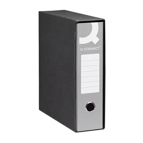 Registratori a leva in cartone. Custodia realizzata in robusto cartone accoppiato a carta liscia nera, certificati FSC, interno rivestito in carta goffrata stampata. 2 anelli in acciaio cromato, con apertura a leva e pressino fermafogli in metallo inserito all'interno del meccanismo. Larghezza 23, altezza 30. Dorso 8, formato A4.