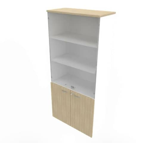 Armadio super con ante base melaminico e ante maxi in vetro e scocca in pannello di conglomerato ligneo spessore 18 mm, rivestito su entrambi i lati con pannello melaminico antiriflesso, antigraffio e lavabile. Fianchi e fondo spessore 18 mm con bordatura sui 4 lati in tinta. Schienale spessore 8 mm. Ripiani spessore 25 mm con bordatura 4 lati in tinta e reggipiani a scomparsa spostabili in altezza ogni 32 mm. Coperchio spessore 25 mm con bordatura 3 lati in vista in ABS antiurto, in tinta, spessore 2 mm. N. 5 piedini livellatori in ABS regolabili in altezza dall'interno del mobile. Ante battenti in pannello di conglomerato ligneo spessore 18 mm rivestito con melaminico antiriflesso, antigraffio e lavabile, bordato sui 4 lati in ABS antiurto in tinta spessore 1,5 mm. Cerniere in metallo con apertura a 105°. Serratura con chiave pieghevole antinfortunistica. Ante in vetro trasparente spessore 4 mm con spigoli smussati e 4 lati bordo lucido. Cerniere in metallo e nylon con apertura a 90°. Serratura con chiave pieghevole antifortunistica. Scocca bianca. Finiture rovere. Dimensione: 90x45xH.200 cm. Quadrifoglio Sistemi d'Arredo presta particolare attenzione alle tematiche della qualità, dell’ambiente e della sicurezza per fornire un prodotto e un servizio all’altezza delle aspettative del mercato. L’azienda ha raggiunto le certificazioni UNI EN ISO 9001/2015, UNI EN ISO 14001/2015 e UNI EN ISO 45001/2018. Nel rispetto e nella tutela dell’ambiente, i prodotti Quadrifoglio sono certificati e garantiti da FSC™ e PANNELLO ECOLOGICO.