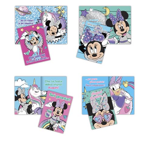 Biglietti auguri Minnie Unicorn glitter. Assortito fantasia. Dimensioni: 11,5x16,8 cm. Grammatura: carta patinata 300 gr/mq. Stampa a 4 colori. Scatola trasparente da 12 pz con busta colorata.