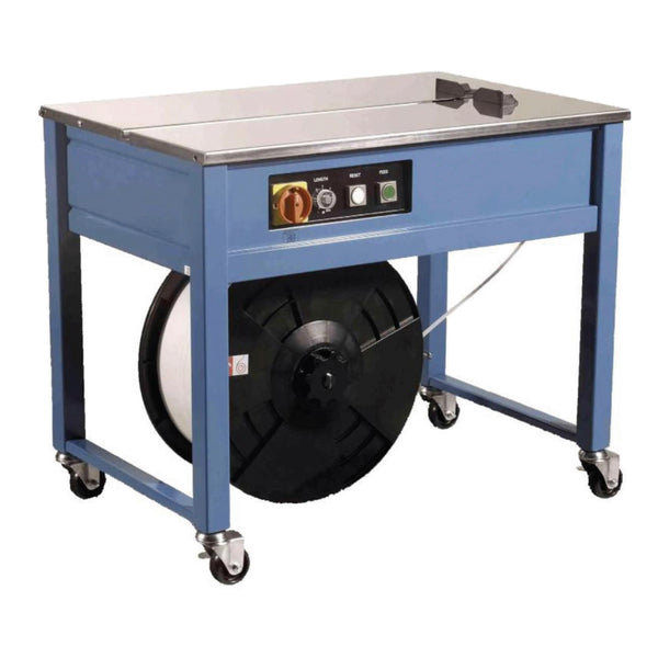 Reggiatrice semiautomatica a termosaldatura per reggette in plastica, alimentazione monofase 220v. Regolabile meccanicamente fino a 45 kg, velocita' di reggiatura 2,5 sec/ciclo. Saldatura a caldo. Monta rotolo con diam. Interno di 200mm. Larghezza reggia da 6 a 15,5mm. Peso 85 kg. Conforme alle direttive 2006/42/ce (direttiva macchine e 2014/30/ue (compatibilita' elettromagnetica. Dimensioni: 90x58,6x76cm, peso: 85kg.ciclo operativo in 2 fasi:1