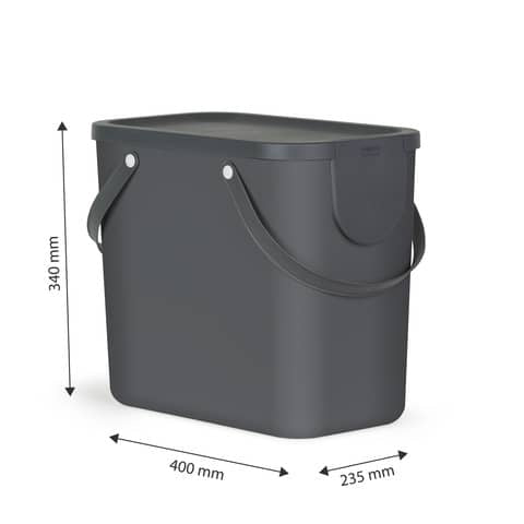 Il sistema di riciclaggio orientato al design. Colori piacevoli e freschi e forma perfettamente pensata. Modulare, impilabile e salvaspazio. 6 adesivi per il secchio grande aiutano a separare i rifiuti. Il piccolo secchio e' ideale per i rifiuti organici, ma anche per capsule di caffe', batterie, ecc. Il coperchio rimane aperto grazie alla cerniera apri/chiudi. Il piccolo secchio si adatta perfettamente a 90 sul secchio grande. 400 x 235 x 340 mm - 25lt
