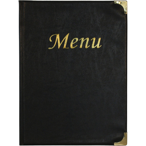 Porta menu' in pvc semplice e classico con angoli in metallo dorato. Formato da 4 buste trasparenti saldate sul dorso e 2 buste saldate sulle facce interne della copertina (per contenere in totale di 10 fogli).