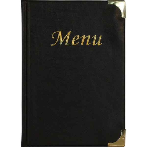 Porta menu' in pvc semplice e classico con angoli in metallo dorato. Formato da 4 buste trasparenti saldate sul dorso e 2 buste saldate sulle facce interne della copertina (per contenere in totale di 10 fogli formato a5
