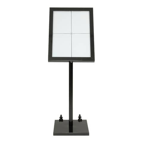 Espositore in acciaio 4xA4 rivestito in colore nero. Contiene 48 Led a luce bianca. Lastra di metallo nero all'interno rimovibile per un facile inserimento e rimozione dei fogli. Vetro di sicurezza. Display posizionabile sia in orizzontale che in verticale. Utilizzabile sia all'interno che all'esterno. Può essere montato a parete o utilizzato con piantana (compresa). All'interno è compreso anche cavo alimentatore da 5m e una serratura di sicurezza con 2 chiavi. Ruote carrello escluse. Possibilità di adoperarlo in modalità wireless acquistando a parte 1 batteria al litio ricaricabile.