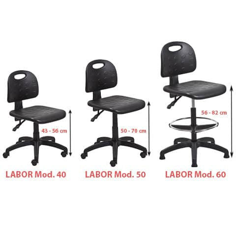 Sgabello tecnico alto Labor Back-system 60 in PU flessibile e lavabile nero con poggiapiedi regolabile. Meccanismo Back-system a contatto permanente, con schienale regolabile in inclinazione e bloccabile in tutte le posizioni e regolabile in altezza con sistema up-down a cremagliera. Pratico per lavori di precisione da seduti su tavoli di altezza 90-105 cm. Dimensioni sedile L. 47 x P. 46 cm. Schienale L. 41 x P. 33 cm. Base D 640 in poliammide caricato 30% fibra di vetro. Regolazione sedile in altezza a gas da 56 a 82 cm. Sedile e schienale con l’interno in multistrato di faggio con sovra-stampato il PU flessibile. Peso 12 kg, portata massima 110 kg. Prodotto 100% Made in Italy. La garanzia è valida nell’ambito di un utilizzo normale e corretto della sedia e non si applica a quelle parti che sono naturalmente soggette ad usura, come i rivestimenti, le imbottiture e le superfici verniciate. La garanzia si applica a tutte quelle parti della sedia che ne garantiscono la funzionalità, come ruote, base, gas, meccanismi. Una qualsiasi manomissione o tentativo di riparazione da parte di persone non specializzate fa decadere automaticamente la garanzia. Questa garanzia non riconosce alcuna responsabilità o diritto di indennizzo per tutti gli eventuali danni, diretti o indiretti, causati da merce difettosa. Per la sicurezza dell’utente, il prodotto viene fornito sempre con i piedini fissi. È comunque possibile, su richiesta specifica, sostituire i piedini fissi con delle ruote acquistando un kit apposito. Si declina ogni responsabilità per incidenti o ribaltamenti dovuti all’utilizzo delle ruote in sostituzione dei piedini.