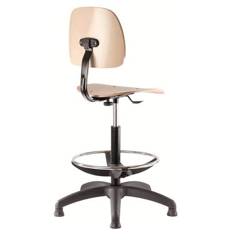 Sgabello tecnico alto Labor Wood 60 in legno con poggiapiedi regolabile. Pratico e resistente in multistrato di faggio verniciato naturale e con lama schienale in acciaio con nervatura coniata per una ottima tenuta. Dimensioni 60 x 60 x 103 cm. Sedile L. 44 x P. 39 cm. Schienale L. 38 x H. 25 cm. Base D600 in poliammide caricato 30% fibra di vetro. Piedini fissi ad innesto rapido in nylon. Meccanismo a piastra fissa con anello poggiapiedi regolabile in nylon e acciaio cromato diametro 400 mm .Regolazioni sedile in altezza a gas da 54 a 82 cm, schienale regolabile in profondità. Sedile multistrato di faggio verniciato naturale spessore 10 mm, schienale multistrato di faggio verniciato naturale spessore 10 mm. Prodotto 100% Made in Italy. La garanzia è valida nell’ambito di un utilizzo normale e corretto della sedia e non si applica a quelle parti che sono naturalmente soggette ad usura, come i rivestimenti, le imbottiture e le superfici verniciate. La garanzia si applica a tutte quelle parti della sedia che ne garantiscono la funzionalità, come ruote, base, gas, meccanismi. Una qualsiasi manomissione o tentativo di riparazione da parte di persone non specializzate fa decadere automaticamente la garanzia. Questa garanzia non riconosce alcuna responsabilità o diritto di indennizzo per tutti gli eventuali danni, diretti o indiretti, causati da merce difettosa. Per la sicurezza dell’utente, il prodotto viene fornito sempre con i piedini fissi. È comunque possibile, su richiesta specifica, sostituire i piedini fissi con delle ruote acquistando un kit apposito. Si declina ogni responsabilità per incidenti o ribaltamenti dovuti all’utilizzo delle ruote in sostituzione dei piedini.