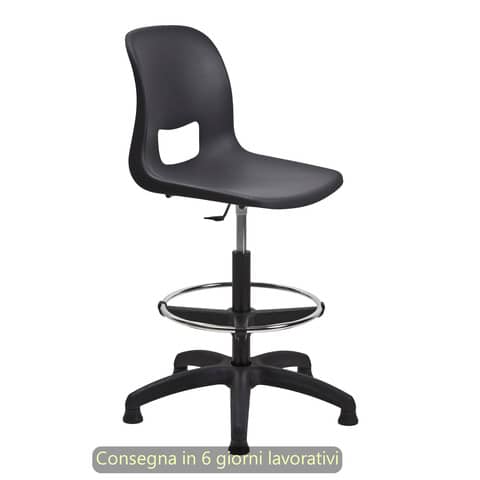 Sgabello tecnico alto VERA 60 con scocca in poliprolilene nero e lavabile e con poggiapiedi regolabile in altezza. Sedile regolabile in altezza a gas, comodo per lavori su tavoli di altezza 90-105 cm. Altezza totale 95/120 cm. Dimensioni sedile L. 44 x P. 41 cm, schienale L. 43 x H. 41 cm. Base D. 640 in poliammide caricato 30% fibra vetro piedini in nylon ad innesto rapido. Regolazioni sedile in altezza a gas da 56 a 82 cm. Schienale in monoblocco con sedile. Peso 8,5 kg, portata massima 110 kg. Prodotto 100% Made in Italy. La garanzia è valida nell’ambito di un utilizzo normale e corretto della sedia e non si applica a quelle parti che sono naturalmente soggette ad usura, come i rivestimenti, le imbottiture e le superfici verniciate. La garanzia si applica a tutte quelle parti della sedia che ne garantiscono la funzionalità, come ruote, base, gas, meccanismi. Una qualsiasi manomissione o tentativo di riparazione da parte di persone non specializzate fa decadere automaticamente la garanzia. Questa garanzia non riconosce alcuna responsabilità o diritto di indennizzo per tutti gli eventuali danni, diretti o indiretti, causati da merce difettosa. Per la sicurezza dell’utente, il prodotto viene fornito sempre con i piedini fissi. È comunque possibile, su richiesta specifica, sostituire i piedini fissi con delle ruote acquistando un kit apposito. Si declina ogni responsabilità per incidenti o ribaltamenti dovuti all’utilizzo delle ruote in sostituzione dei piedini.