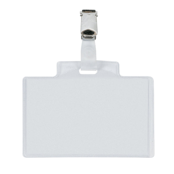Porta nomi in pvc trasparente, alto spessore, completi di pinzette in metallo e cartoncini. Adatti a congressi, riunioni, visite guidate. Apertura lato corto (laterale). Formato 95x60 mm.