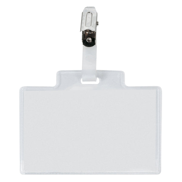 Porta nomi in pvc trasparente, alto spessore, completi di pinzette ''a pinza'' e senza cardoncini. Apertura lato corto (laterale. Adatti a congressi, riunioni, visite guidate. Formato contenuto 95x60mm.