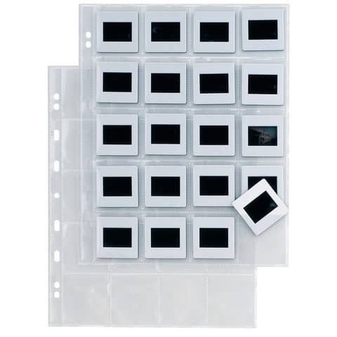 Buste porta diapositive in PP liscio con foratura universale, dotate di 20 spazi (5,5x5,5 cm). Fomato busta 22x30 cm.