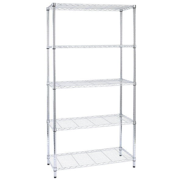 Librerie in acciaio cromato con tubolari diametro 2,54 e piedini regolabili. 5 ripiani - 36x90cm h177cm. Portata max 25kg per ripiano.