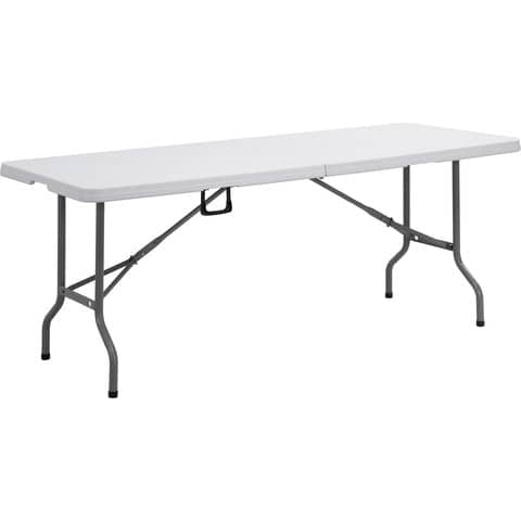 Tavolo rettangolare con piano in polietilene bianco e base in acciaio verniciato nero, con piano e gambe pieghevoli e richiudibile come una valigetta con maniglia. Dimensioni: L183 x P76 x H74 cm.