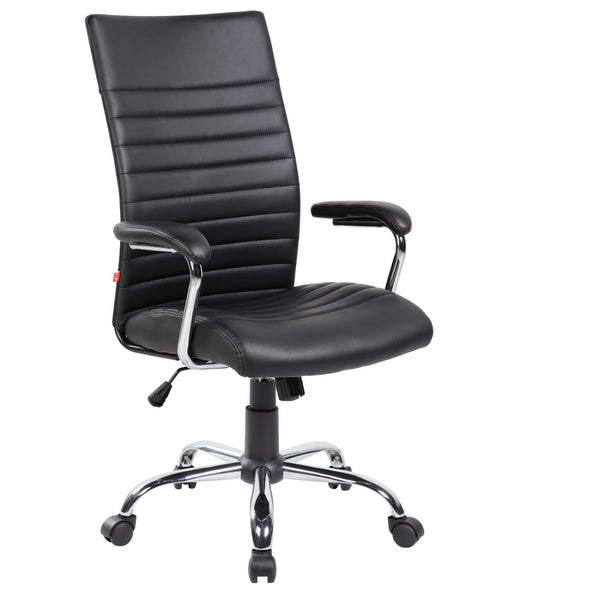 Poltrona a schienale alto rivestita in pu. Braccioli e base in acciaio con ruote in nylon. Meccanismo oscillante bloccabile. Manopola per la regolazione di tensione della spinta. Larghezza fuori tutto cm 65; larghezza seduta cm 49; profondita' cm 63; altezza cm 108/118; h.seduta cm 45-55.