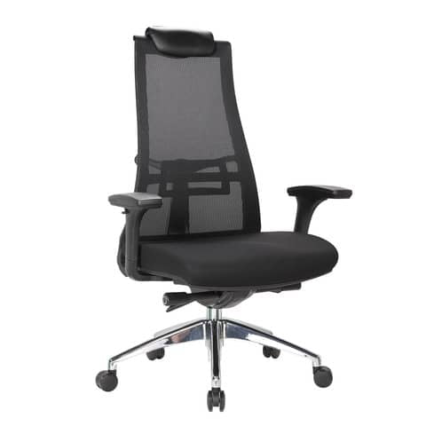 Poltrona direzionale con braccioli Milwaukee rivestita in tessuto di colore nero e schienale in rete tecnica traspirante. Con poggiatesta in PU imbottito e supporto lombare. Braccioli morbidi in PU orientabili e regolabili in altezza e in profondità. Schienale regolabile in 4 posizioni. Seduta ampia e sagomata in schiuma ad alta densità. Meccanismo Syncro. Sistema di elevazione a gas per la regolazione del sedile in altezza. Manopola per la regolazione di tensione. Razze in alluminio con ruote piroettanti in poliuterano. Struttura in polipropilene.