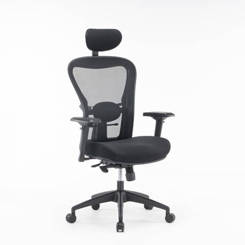 Poltrona direzionale con braccioli Pasadena rivestita in tessuto nero e con schienale in rete tecnica traspirante di colore nero. Poggiatesta in tessuto imbottito regolabile. Supporto lombare regolabile in altezza. Braccioli morbidi in PU, orientabili e regolabili in altezza e in profondità. Schienale regolabile in più posizioni. Seduta ampia e sagomata in schiuma ad alta densità, regolabile in altezza e profondità. Meccanismo Syncro. Razze nere in nylon con ruote piroettanti in PU. Struttura in polipropilene nero. Sistema di elevazione a gas per la regolazione del sedile in altezza. Manopola per la regolazione di tensione della spinta.