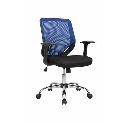 Poltrona operativa con braccioli Tucson rivestita in tessuto con schienale in rete tecnica traspirante di colore blu. Razze in acciaio cromato con ruote piroettanti. Sistema di elevazione a gas per la regolazione del sedile in altezza. Meccanismo oscillante bloccabile. Regolazione di tensione della spinta.