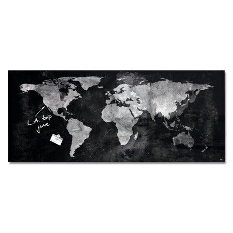 Lavagna magnetica in vetro Artverum. Vetro di sicurezza tipo ESG con 25 anni di garanzia, sistema di aggancio omologato TUV. Design più volte premiato a livello internazionale. Design Worldmap. Formato 130x55x1,5 cm.