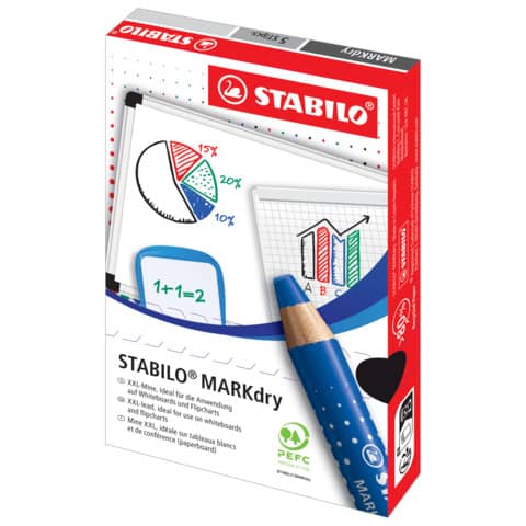 Stabilo MARKdry è un matitone colorato pensato per lavagne bianche e a fogli mobili. Colore: nero. Proprio come se fosse un marcatore, scrive su lavagne bianche, in ardesia e a fogli mobili, oltre alla carta e diverse superfici lisce come il vetro. Inoltre, può essere cancellato con un semplice panno umido o asciutto. Grazie alla robusta mina XXL, il colore rimane intenso fino all'ultimo tratto. Stabilo MARKdry è pronto all'uso in qualsiasi momento! Non secca, non macchia, è inodore ed è cancellabile senza lasciare tracce e sbavature. Perfetto per la scuola o per l'ufficio, è realizzato al 100% con legno ecosostenibile e certificato PEFC.
