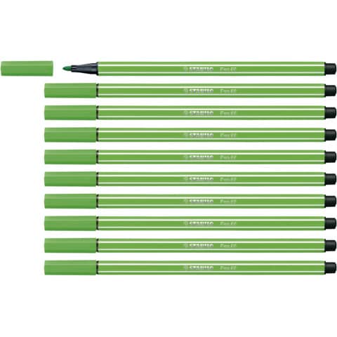 Pennarelli con punta in fibra. Resistono fino a 24 ore senza il cappuccio. Inchiostro a base d’acqua, inodore. Parzialmente acquarellabile. Cappuccio ventilato anti soffocamento. Tratto 1 mm. Colore verde chiaro.