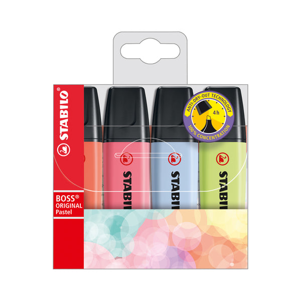 Evidenziatore stabilo boss pastel. Nuovi colori pastello per completare una gamma di successo. Per chi ama evidenziare con colori piu' delicati e alla moda. Doppia ampiezza di tratto 2+5mm. Tecnologia stabilo anti-dry-out: resiste fino a 4 ore senza cappuccio.astuccio 4 evidenziatori pastel lime/fior di ciliegio/azzurro ghiaccio/rosa corallo