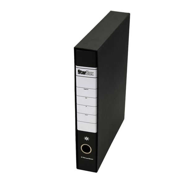 Registratore starline modello starbox, con struttura in cartone rivestita in carta goffrata stampata e risguardo bianco. Dotato di meccanismo a leva in acciaio nichelato con pressino. Custodia in fibrone nero rivestita in carta usomano. Anello di estrazione in metallo.il registratore starbox e' disponibile in 4 modelli (protocollo e commerciale, dorso 5 e dorso 8 e in un'ampia gamma di colori