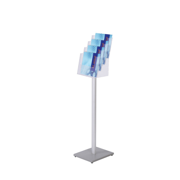 Serie economica. Espositore con stelo in alluminio, base in mdf laccata. A 4 tasche a4. Fissaggio delle tasche tramite avvitamento con due viti fornite in dotazione, dimensioni 24x110cm