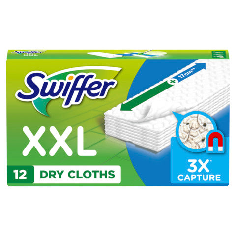Ricariche panni cattura polvere XXL. Dite addio alla polvere, peli e capelli con Swiffer. Swiffer è la linea di panni cattura polvere. Con la scopa ed i panni Swiffer puoi catturare 3 volte più sporco rispetto ad una scopa tradizionale. Grazie al motivo ondulato e alle scanalature, i potenti panni Swiffer lasciano i pavimenti puliti anche sulle superfici irregolari. Dimensioni panno: 46 x 26 cm. Confezione composta da 12 panni.