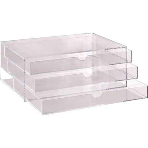 Cassettiera da banco realizzata in acrilico trasparente. Può essere fornita di divisori, da acquistarsi a parte, per la suddivisione dei cassetti in 6, 9 o 15 spazi. Formato 32.5x23.5x13 cm.
