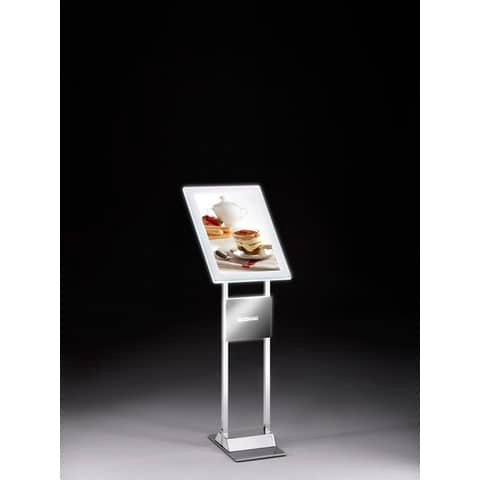 Comodo e pratico leggio da interno con cornice LEDMAG retroilluminata a LED formato A4 verticale/orizzontale. Piantana in acciaio cromato, alimentatore esterno. Ideale per ristoranti, sale riunioni, agenzie e spazi espositivi in genere. Dimensioni: 25 x 40 x 120 cm. Peso netto: 9 Kg. Peso Lordo: 11 Kg.