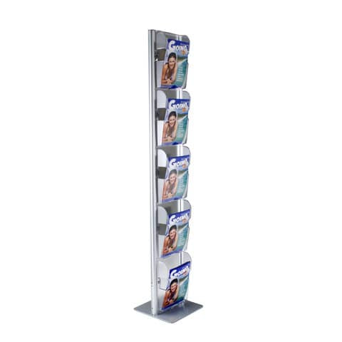 Espositore da terra porta depliant/cataloghi Menhir, con vaschette Ice formato A4. Le vaschette sono realizzate in materiale plastico trasparente e applicate con bottoni a fissaggio rapido su pannello in acrilico trasparente. Formato 33x33x173 cm. Disponibile crowner (cod. KCRW11) per la personalizzazione dell'espositore.Con 10 Vaschette Ice