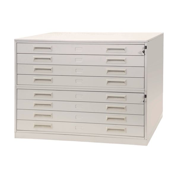 Portadisegni orizzontale in metallo a 8 cassetti idoneo a contenere fogli formato uni a0. Bordi arrotondati raggio mm. 8. Verniciatura a polveri epossidiche colore grigio chiaro ral 7035. Formato da 2 corpi sovrapposti, 1 coperchio e 1 zoccolo. Dimensioni utili cassetto:125lx87px11,5hcm. Dimensioni esterne:137lx96px122hcm. Fornito montato.