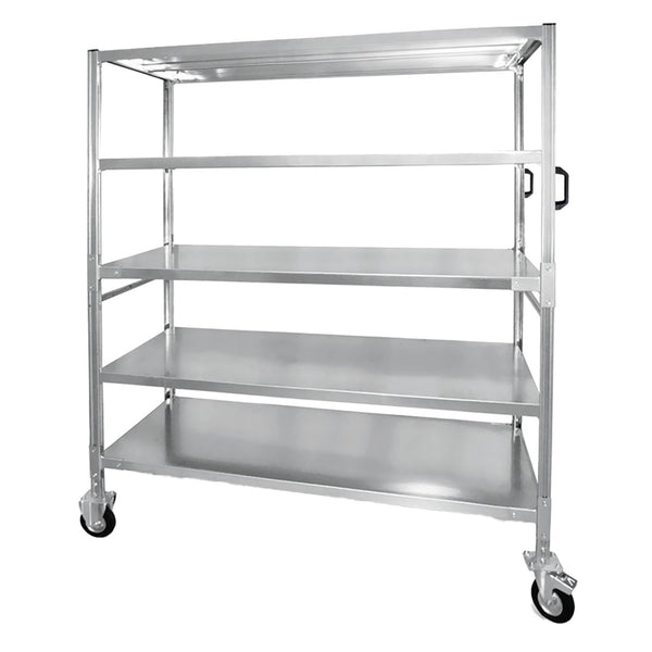 Carrello zincato con struttura in profilato, 5 piani regolabili con 1 rinforzo e ganci, fasce di stabilita', 2 maniglie e ruote diametro 12,5cm con cuscinetti a rulli, 2 fisse e 2 girevoli di cui 1 frenante. Portata 300 kg. Dimensioni: mm. 151lx67px165,5hcm. Fornito smontato.