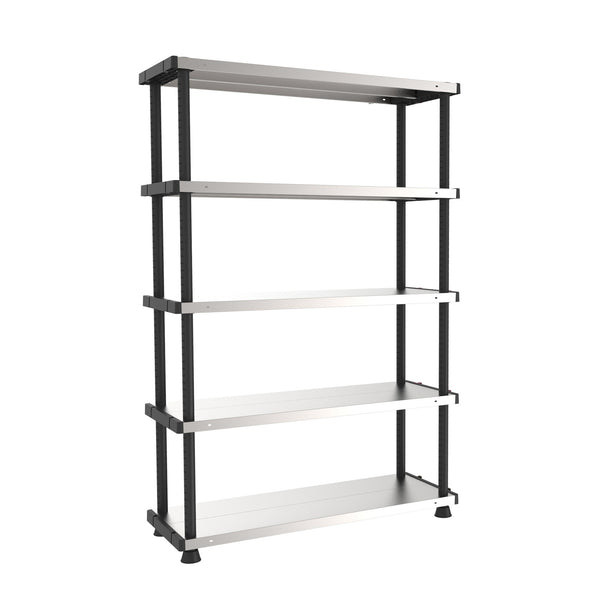 Scaffale composto da 4 montanti verticali in plastica nera con piedini regolabili in altezza. 5 ripiani in metallo regolabili con profondita' di 45cm con portata massima di 120kg per ripiano. Montaggio dello scaffale stimato in 10''. Possibilita' di fissaggio a parete.