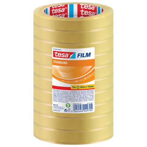 Tesafilm® standard è un nastro adesivo multiuso da usare a scuola, a casa e in ufficio. È molto versatile e adatto a molte applicazioni. Si può usare come nastro per i lavori manuali o in ufficio. E' ideale anche per riparare fogli di carta o incartare regali. Il nastro trasparente è senza PVC e senza solventi tossici. Ha una buona adesività e una elevata resistenza ai raggi UV e all'invecchiamento. Si svolge silenziosamente e può essere strappato a mano. Si può usare con qualsiasi dispenser tesafilm® manuale e da scrivania. Torre composta da 10 nastri adesivi.