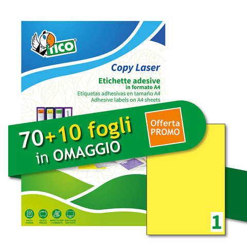 TICO - Etichette giallo fluorescente permanenti laser/inkjet 1 et./foglio conf. 70+10 ff omaggio 210x297 mm - LP4FG-210297P
