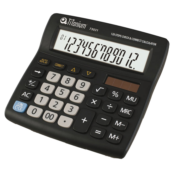 Calcolatrice con tastiera large. Display: grande a 12 cifre. Doppia alimentazione: batteria e solare. Funzione brevettata checkecorrect (memorizza le ultime 120 battute con possibilita' di controllo ed eventuale correzione: si. Tasti memoria: si. Calcolo del margine: simark-up (mu: sicalcoli percentuali: si. Radice quadrata: si. Tasto shift per la cancellazione dell'ultima cifra immessa: si. Separatore migliaia: sivisualizzazione dei simboli delle operazioni ( + - x ¸ : si