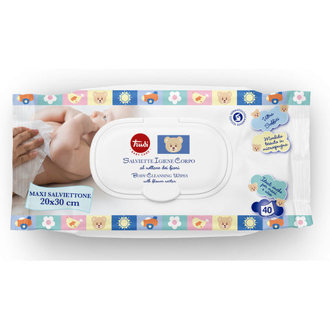 Le salviette igiene corpo Trudi Baby Care sono state studiate partendo dalla formulazione e dal tessuto delle classiche Salviettine Trudi Baby Care per il cambio del pannolino. Grazie alle dimensioni quasi doppie rispetto alle classiche salviettine, consentono non solo un più agevole utilizzo in occasione del cambio ma fungono anche da ''guanto igienico'' per la pulizia di tutto il corpo (in tutte quelle occasioni dove è consigliabile un ''bagnetto'' senza risciacquo). Dermatologicamente testato. Conservare in luogo fresco ed asciutto e lontano da fonti di calore. La confezione deve essere consumata entro 3 mesi dall'apertura (PAO 3 mesi). Non utilizzare su cute lesa. Per uso esterno. Tenere lontano dalla portata dei bambini. Dimensioni salvietta : 300 x 200 mm. Composizione salvietta: 40%VISCOSA-60%POLIESTERE. Tessuto salvietta: liscio. Grammatura salvietta: 45 g/m². Confezione da 40 salviette.
