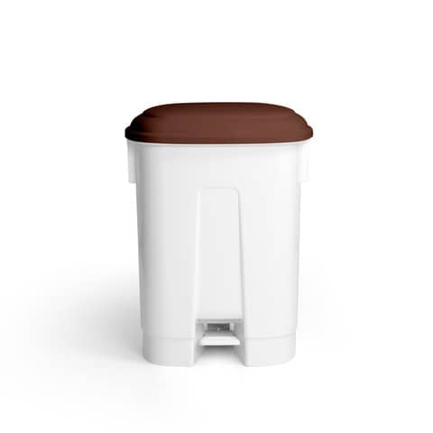 Pattumiera bianca a pedale Debry con coperchio marrone dotato di porta-assorbiodori e ruote 100 mm. Versione con adattatore 2 x 30 L per creare pratici reparti in cui conferire diverse tipologie di rifiuti, favorendone il riciclo. Il coperchio dotato di vaschetta porta pastiglie assorbi odori. L'asta per il sollevamento del coperchio è completamente in plastica. Il pedale consente l’utilizzo senza il contatto con le mani. Conforme alla normativa H.A.C.C.P. che prescrive contenitori che evitino il contatto delle mani e facili da pulire e disinfettare. Dimensioni 50 x 36 x 68 cm.