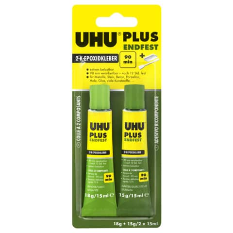 Uhu Plus è un adesivo bicomponente a base di resina epossidica per incollaggi difficili che richiedono un'eccezionale resistenza. Il prodotto consente incollaggi resistenti nel tempo, agli urti, all'umidità e alle temperature (dai – 20°C ai + 100°C).UHU Plus è adatto per incollare molte materie plastiche, metalli, pietra, calcestruzzo, porcellana, ceramica, legno, vetro e derivati del vetro, polistirolo espanso. Caratteristiche: senza solventi, tempo di lavorazione circa 90 minuti, indurimento definitivo a temperatura ambiente dopo 12 ore, velocizzabile con il calore. Rapporto in volume dei componenti 1:1. Una volta indurito è possibile perforare, bucare e biancheggiare. Contenuto 2x15 ml.