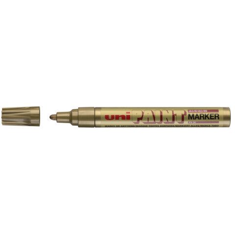 Marcatore permanente con inchiostro pigmentato a base d'olio, resistente alla luce, all'acqua e al calore fino a 250°. Non contiene zolfo, cloro e silicio. Per scrivere, riparare, ritoccare e decorare in modo indelebile tutte le superfici, come metallo, plastica, legno, vetro, tessuti senza che i colori perdano la loro brillantezza. Ideale per uso industriale e professionale, è utilizzato anche per decorare oggetti in ambito scolastico e domestico. Fusto in alluminio. Tratto medio. Punta in materiale sintetico 2,8 mm. Colore inchiostro: oro.Argento Blu Bianco Nero Rosso Verde Scuro