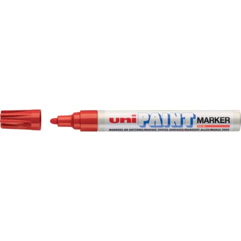 Marcatore permanente con inchiostro pigmentato a base d'olio, resistente alla luce, all'acqua e al calore fino a 250°. Non contiene zolfo, cloro e silicio. Per scrivere, riparare, ritoccare e decorare in modo indelebile tutte le superfici, come metallo, plastica, legno, vetro, tessuti senza che i colori perdano la loro brillantezza. Ideale per uso industriale e professionale, è utilizzato anche per decorare oggetti in ambito scolastico e domestico. Fusto in alluminio. Tratto medio. Punta in materiale sintetico 2,8 mm. Colore inchiostro: rosso.Argento Blu Bianco Nero Oro Verde Scuro