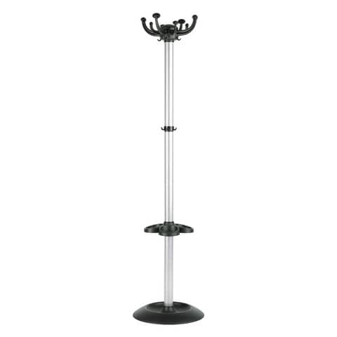 Appendiabiti da terra con portaombrelli provvisto di 8 appendini e 4 ganci. Struttura in metallo verniciato con polveri epossidiche. Basamento in polipropilene nero. Manicotto portachiavi con 4 punti di aggancio. Altezza 176 cm, diametro base 40 cm. Colore: grigio.