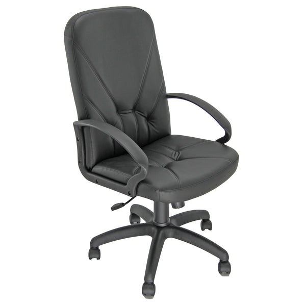 Poltrona in similpelle nera con schienale medio e fisso.braccioli e base con ruote in nylon. Meccanismo oscillante con blocchi. Elevazione a gas. Altezza totale: 97-107cmprofondita' totale: 62 cmaltezza seduta: 44/54 cmlarghezza sedile: 50 cmlarghezza sedile con braccioli: 57 cmnel tessuto classe plus sky disponibile solo nel colore nero.
