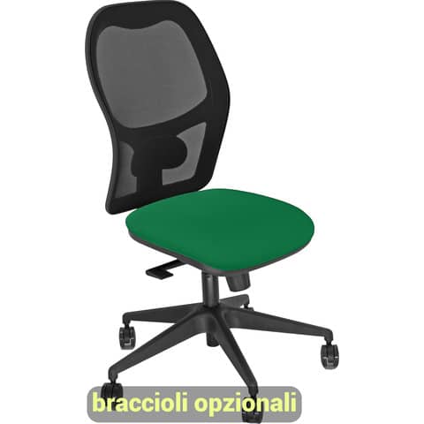 Struttura in acciaio, schienale in Nylon. Rivestimento sedile Eco, 100% Polipropilene 380g m/l, cucito artigianalmente. Colore verde. Con ruote, braccioli opzionali (codici 110071, 110072, 110074, 110075).
