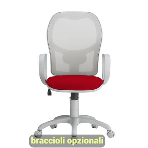 Struttura in acciaio, schienale in Nylon a rete. Rivestimento del sedile in tessuto ignifugo Classe No Flame, fibra modacrilica, reazione al fuoco classe 1 – 380g m/lin, di colore rosso. Con ruote, braccioli opzionali.