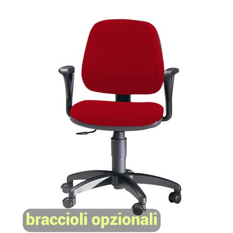 Struttura in acciaio nero, base in Nylon, guscio inferiore e dorsale in PPL nero. Rivestimento di sedile e schienale in tessuto ignifugo Classe No Flame, fibra modacrilica, reazione al fuoco classe 1 – 380g m/lin, di colore rosso. Con ruote, braccioli opzionali.