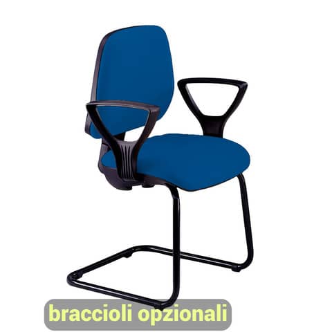 Struttura cantilever in acciaio nero, guscio inferiore e dorsale in PPL nero. Rivestimento di sedile e schienale in tessuto Eco, 100% Polipropilene 380g m/l, di colore blu. Braccioli opzionali.
